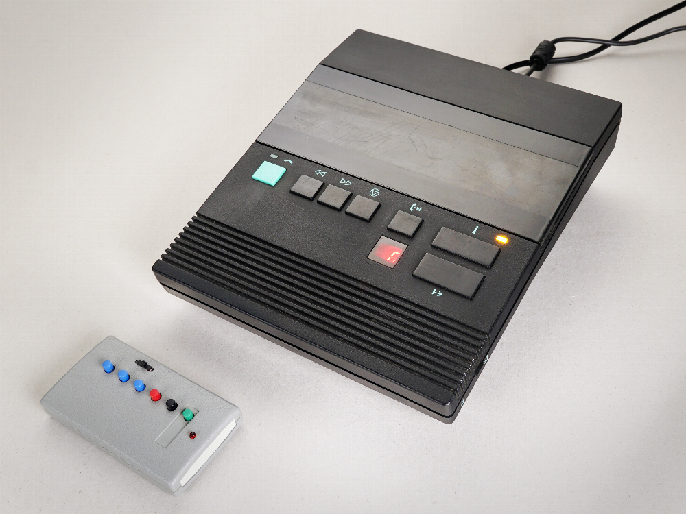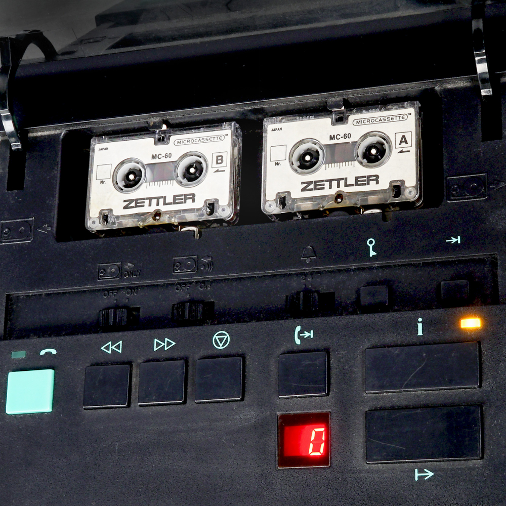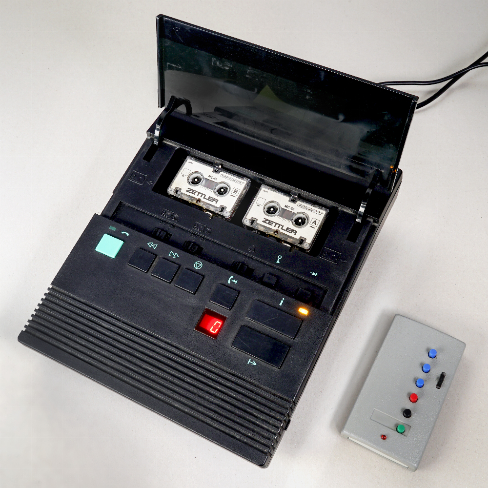 Anrufbeantworter Typ "Zettler" mit 2 Mini-Kassetten. Das Gerät ist speziell für Filmzwecke umgebaut, es ist kein Telefonanschluss erforderlich. Per Funk wird der Lauf der Kassetten gesteuert, die Leds und das Zahlendisplay für die Anzahl der Anrufe können ebenfalls per Funk bedient werden.