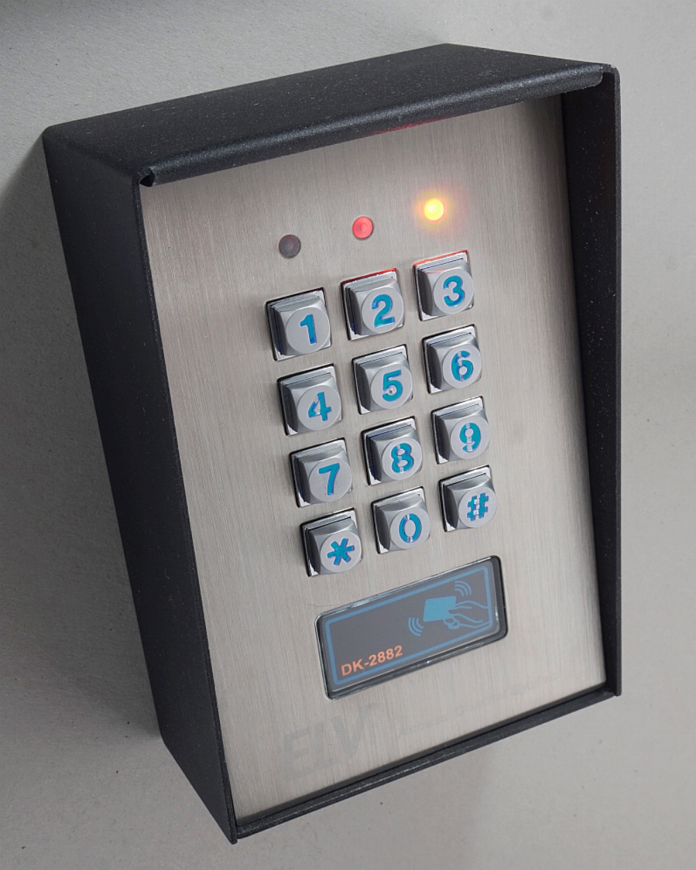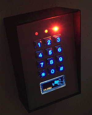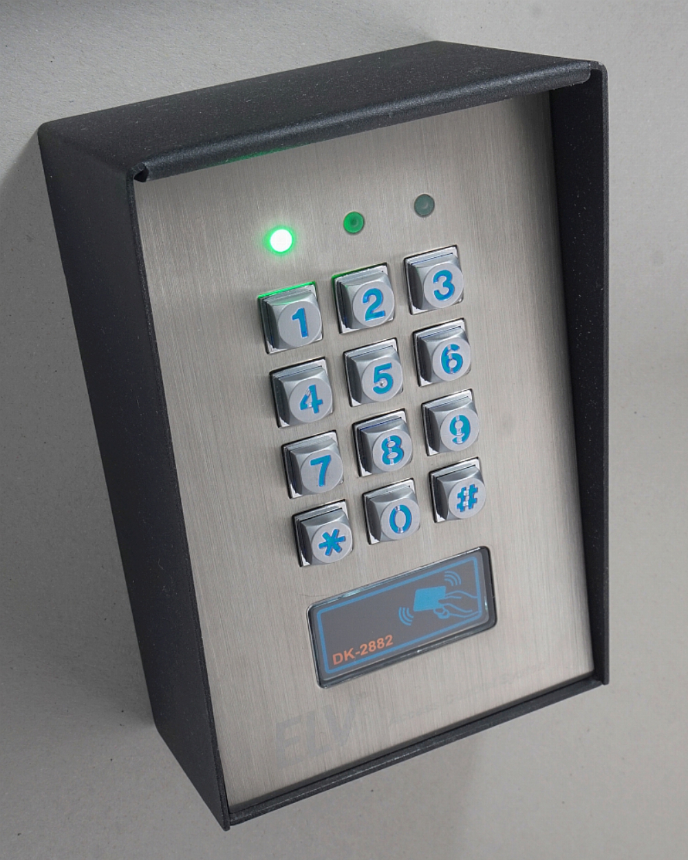 Das Codeschloss hat ein Metallgehäuse in schlichter Ausführung, von der Optik her eher für den Außenbereich. Es könnte zum Beispiel an einer Schranke oder einem Tor in einer Grundstückszufahrt hängen. Das Gerät ist batteriebetrieben, nach fünf beliebigen Tastendrücken wechseld die Led von rot auf grün. Bei der Eingabe wird auch die Tastaturbeleuchtung eingeschaltet.