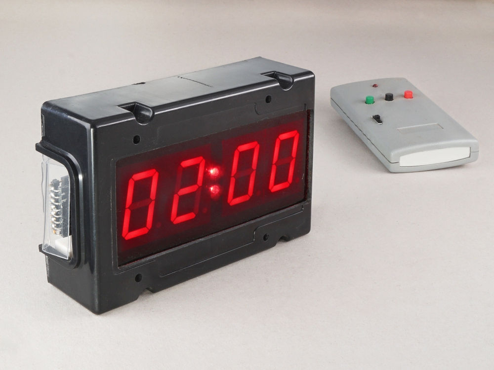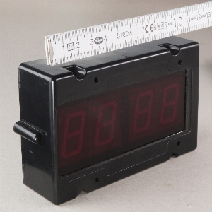 4-stelliger Countdownzähler im schwarzen Kunststoffgehäuse, kann mit beiliegender Funkfernbedienung gesteuert werden. Funktionen der Funkfernbedienung: Start-Stop-Reset, Einstellen und Speichern der Startzeit.