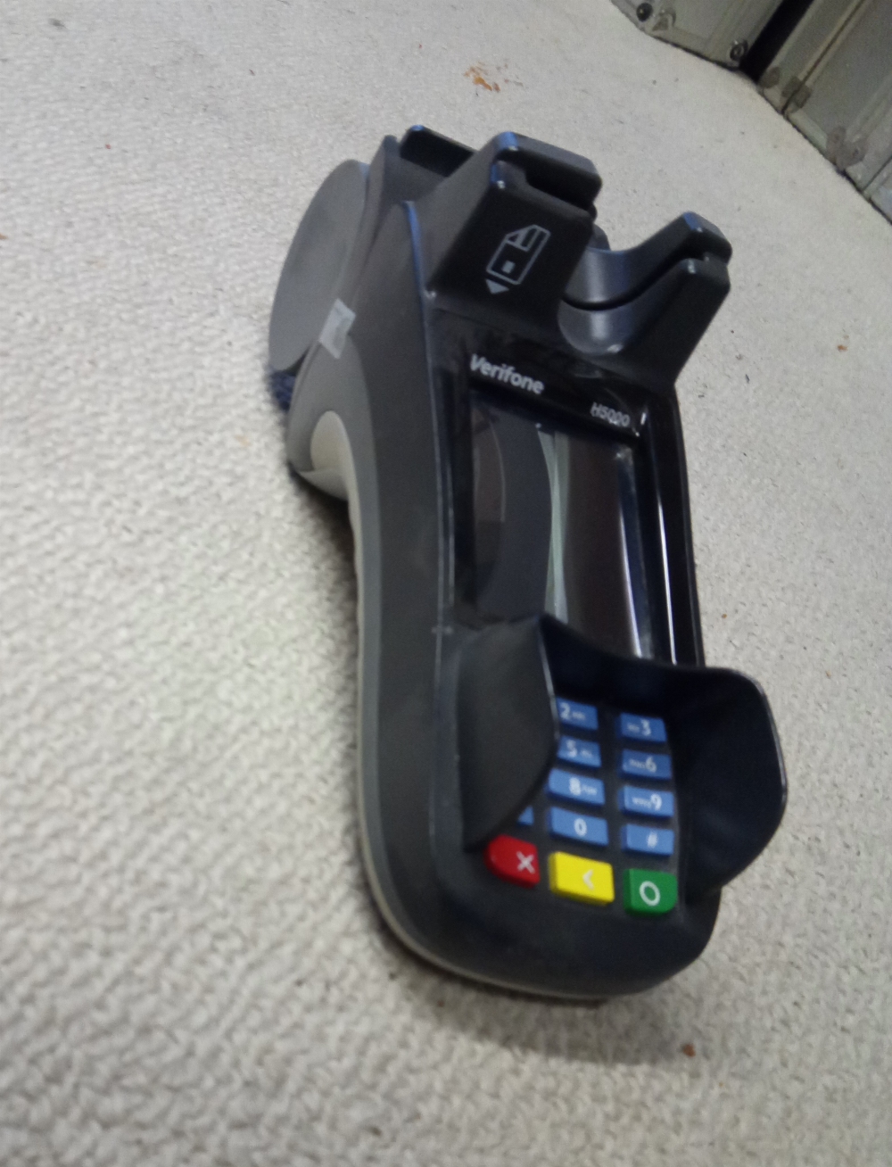 Dies ist ein EC-Kartenleser, wie er normalerweise auf der Ladentheke steht. Das Gerät ist noch nicht umgebaut, ist also im Moment reine Deko, ohne Funktion.