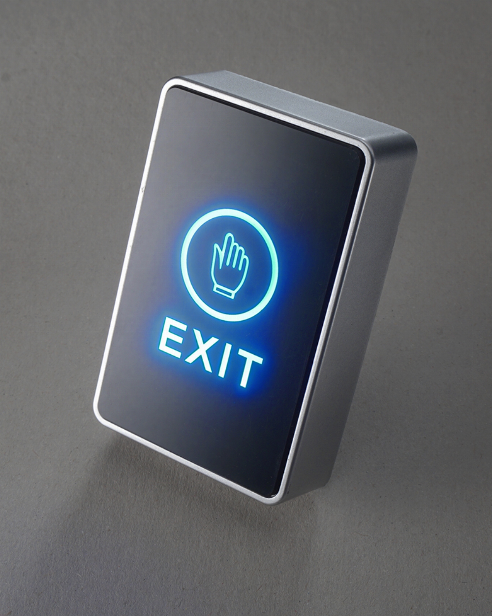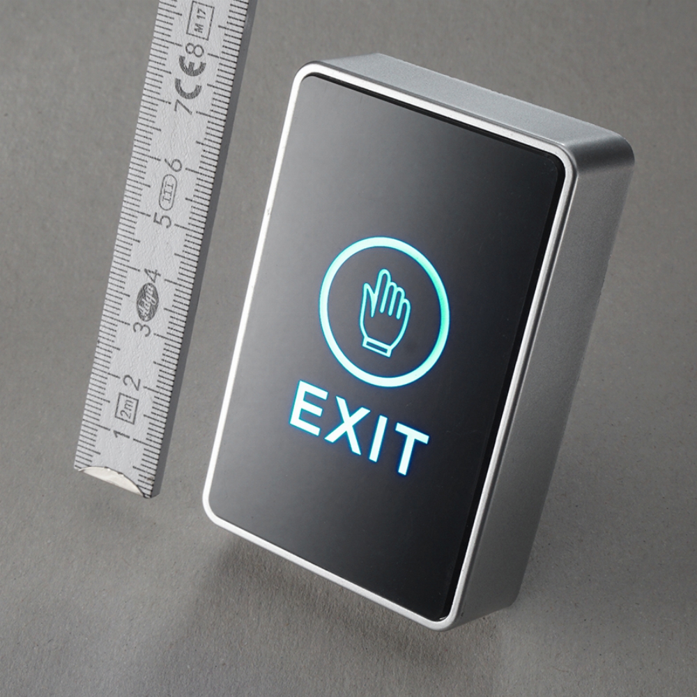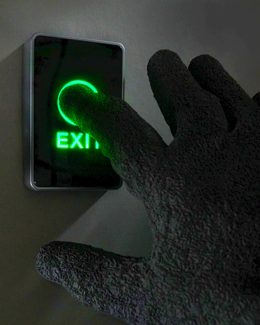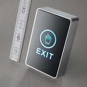 "Exit-Button", eignet sich besonders für den Ausgang gesicherter Räume, vor allem, wenn der Eintritt auf der anderen Seite mit einem Codeschloss gesichert ist. Der Button ist batteriebetrieben, die Hintergrundfarbe wechselt bei Berührung von blau auf grün. Das Gerät benötigt keinerlei Kabel oder Steuerung, kann also einfach neben die Tür geklebt werden.