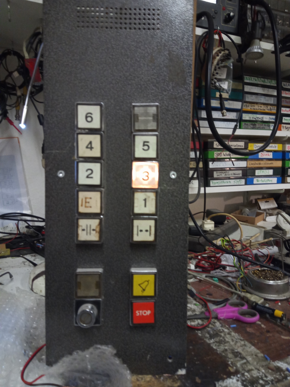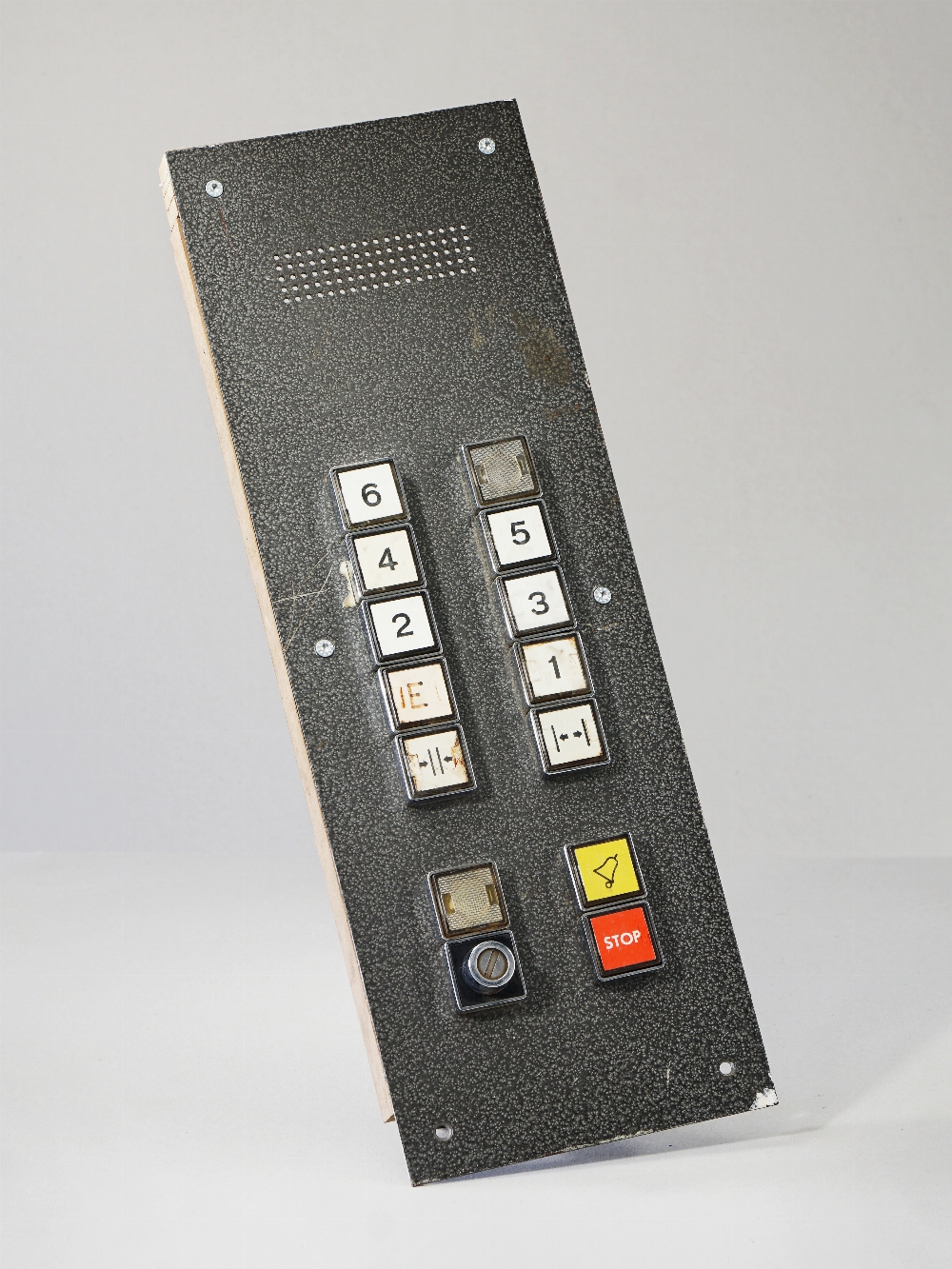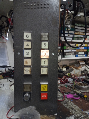 Bedientableau für einen Fahrstuhl älterer Bauart, speziell für Filmzwecke umgebaut, die Tasten lassen sich betätigen, die Tastenbeleuchtung ist über Funk steuerbar.