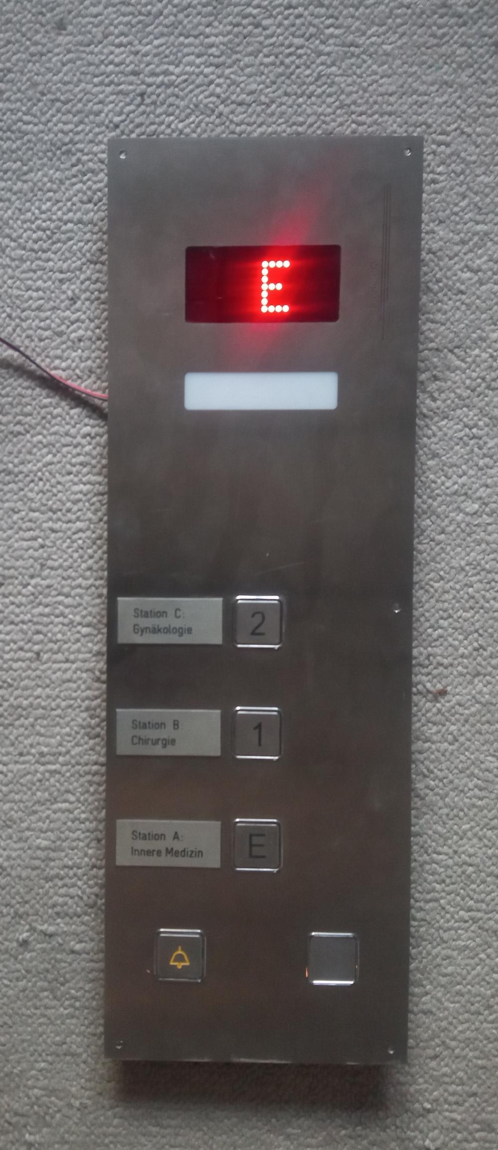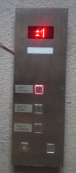 Dies ist eine Fahrstuhlsteuerung für ein Krankenhaus oder mit anderer Beschriftung auch eine Lagerhalle mit Erdgeschoss und 2 Etagen. Die Steuerung ist völlig autonom funktionsfähig, d. h. bei Knopfdruck leuchtet der Rahmen um die Taste, einen Moment später zeigt das Display mit Pfeilen die Fahrt an bis der Fahrstuhl wieder anhält und das neue Stockwerk anzeigt.