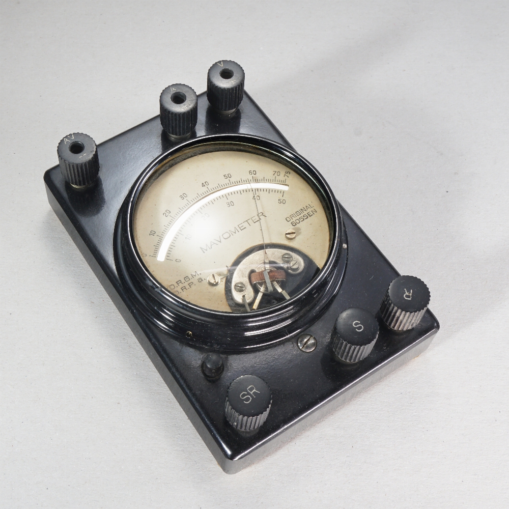 Mavometer bedeutet Multi-Ampere-Volt-Meter. Dies ist der Vorgänger der heutigen Multimeter, denn so, wie man heute die Messbereiche mit einem Wahlschalter einstellt, mußte man zu diesem Zweck zusätzliche Vorwiderstände anklemmen. Den daraus resultierenden Messwert mußte man sich dann anhand der Skalenanzeige selbst ausrechnen. D.R.P = deutsches Reichspatent, das Gerät muss also aus den '30er Jahren stammen.