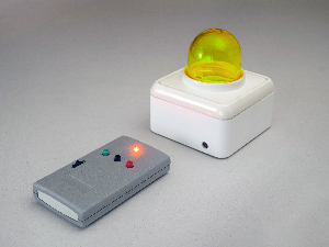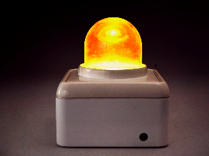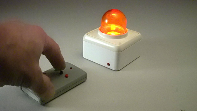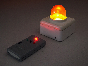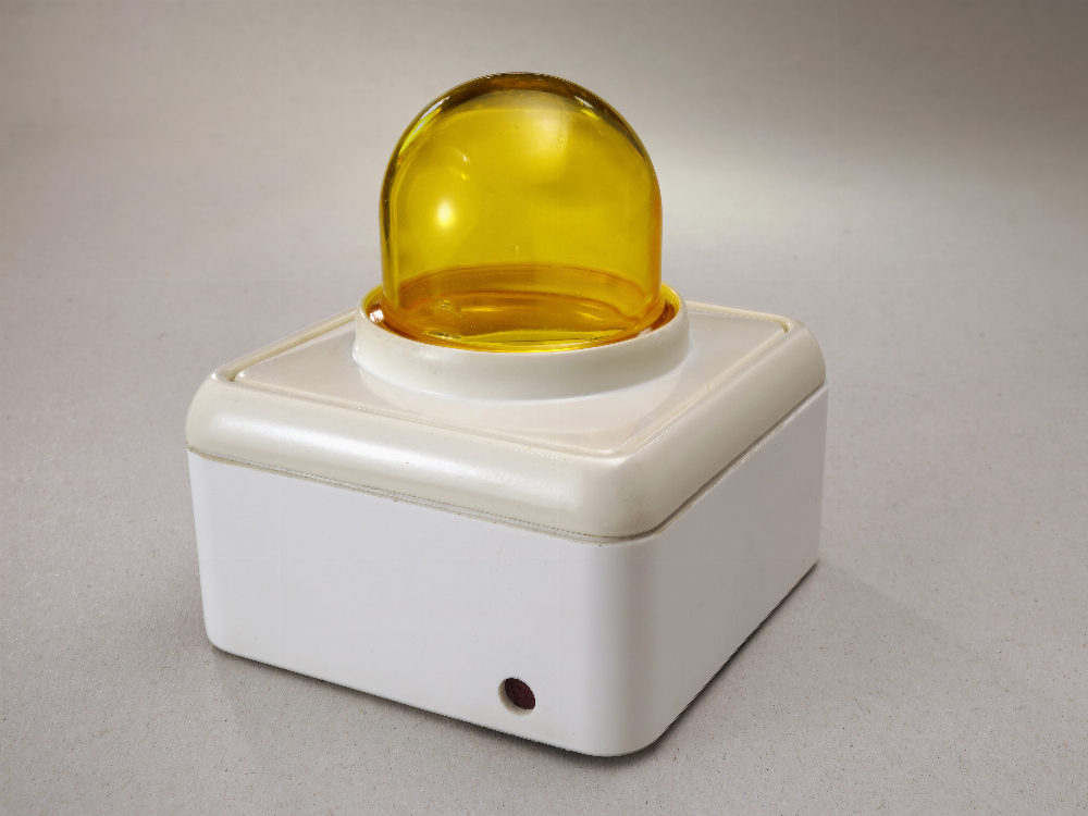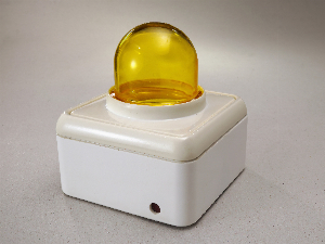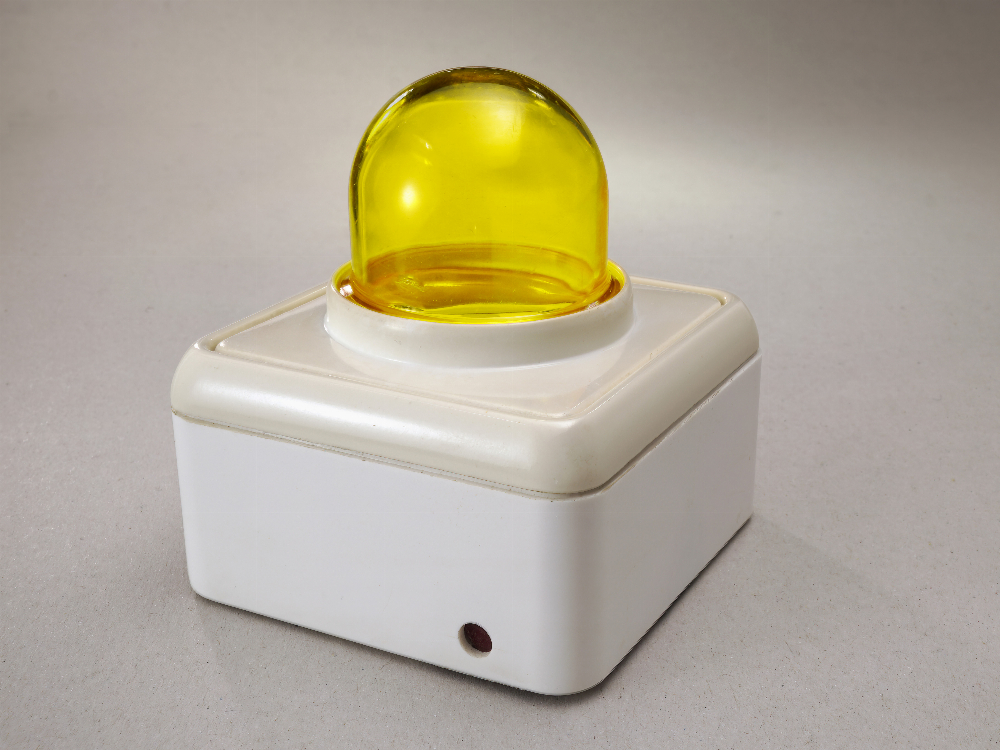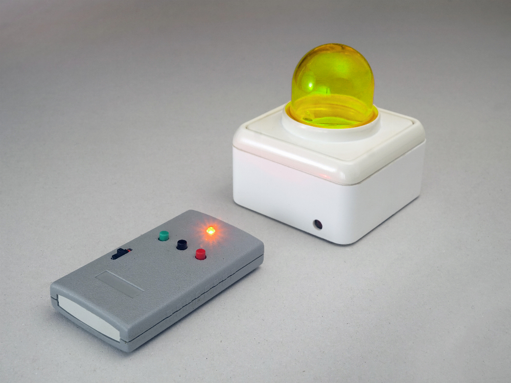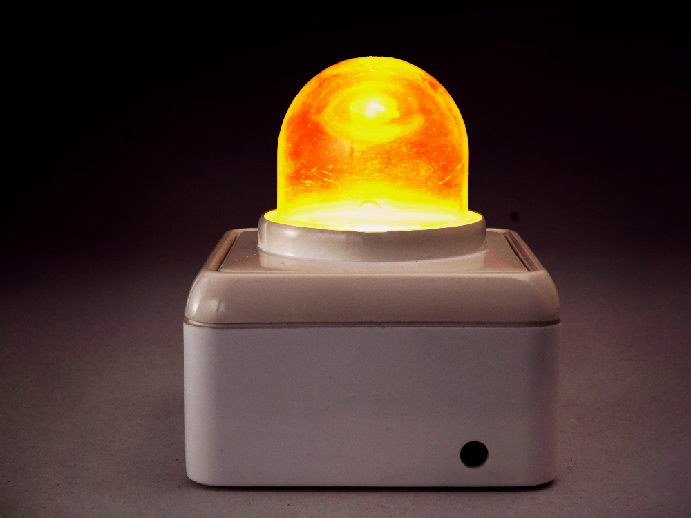 Meldeleuchte mit gelb/oranger Abdeckung, speziell für Filmzwecke umgebaut auf Batteriebetrieb und Ansteuerung über Funk, kann also ohne weitere Verkabelung einfach an die Wand geklebt werden. Die Abdeckung ist gelb/orange, innen leuchtet oder blinkt eine rote Led, die sich per Funksteuerung schalten läßt.