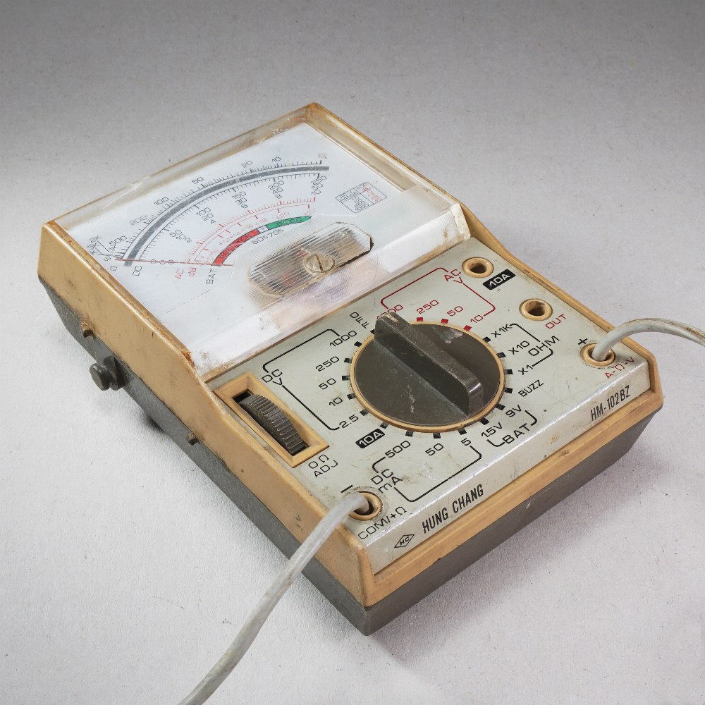 Analoges multimeter des Herstellers HUNG CHANG, vermutlich aus den '80er Jahren, mit deutlichen Gebrauchsspuren und ein wenig verbastelt, aber durchaus funktionsfähig.