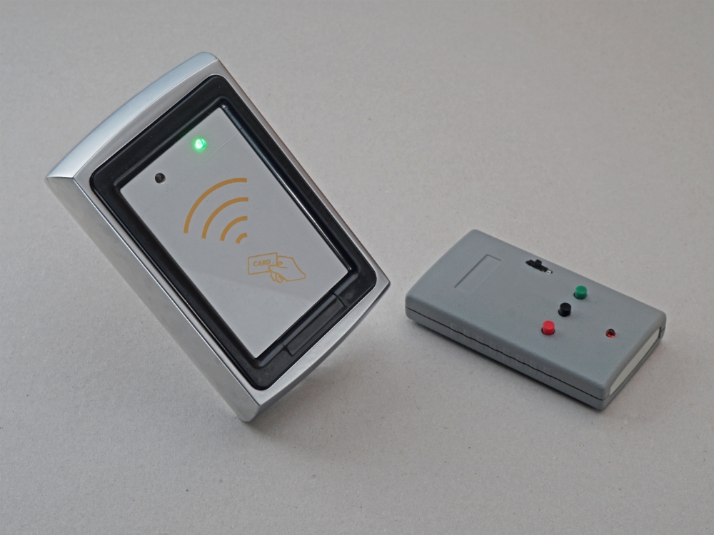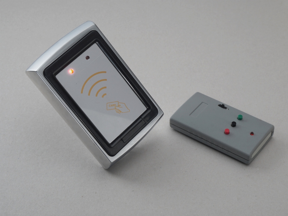 Dies ist ein RFID-Kartenleser, bei dem die Karte vor das Gerät gehalten wird. Da das Gerät für Filmzwecke umgebaut ist, funktioniert es mit jeder beliebigen Karte. Die Leds im Gerät werden mit einer Fernbedienung umgeschaltet, sodass auch gezeigt werden kann, dass der Zugang verwehrt wird.