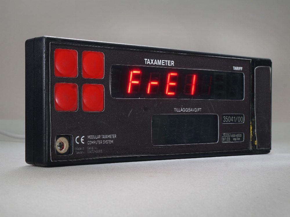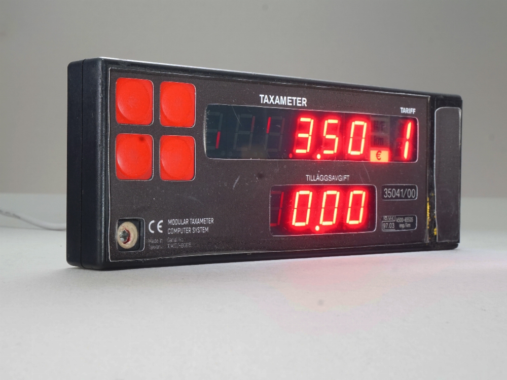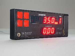 Taxameter, das unabhängig vom Fahrzeug Preise wie während der Fahrt anzeigt. Die Bedienung (Frei - Startpreis - laufende Fahrpreisanzeige) erfolgt mit den Tasten am Display, Stromversorgung über 12V Zigarettenanzünder im Fahrzeug.