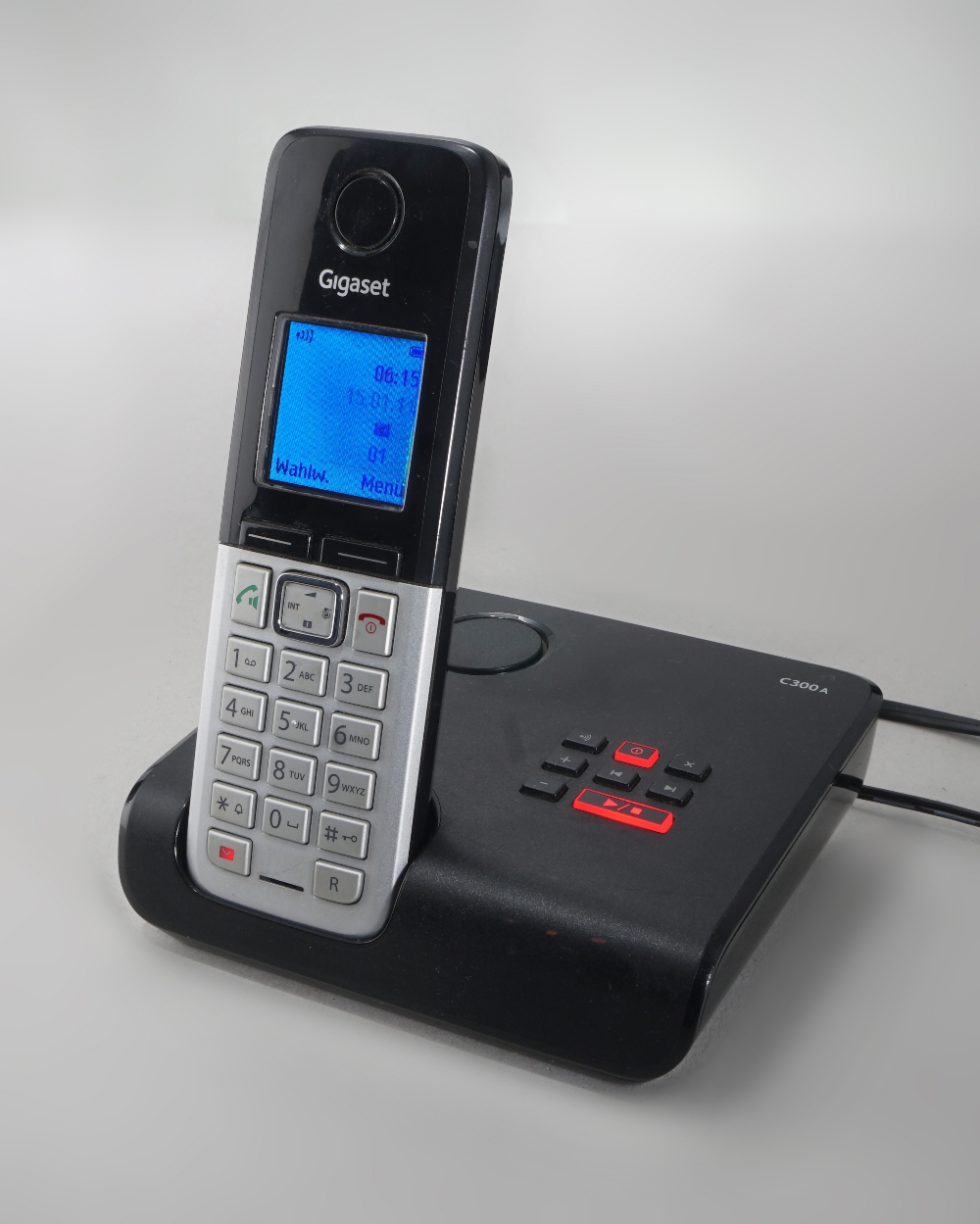 Das mobile Siemens Gigaset ist voll funktionsfähig, d.h. das Display leuchtet auf beim Bedienen, die Anzeigen sind so wie im normalen Betrieb. Mit unserem Klingelkasten kann ein eingehender Anruf simuliert werden, auch wenn kein Festnetzanschluss zur Verfügung steht.