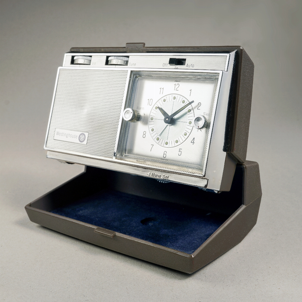 Dies ist eine Original Westinghouse Travel-Alarm Clock. Die Uhr ist im Originalzustand, das Uhrwerk ist mechanisch, das Radio empfängt nur AM.