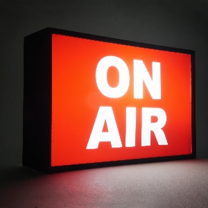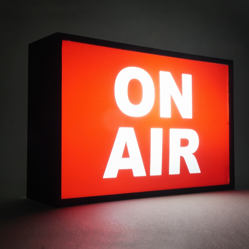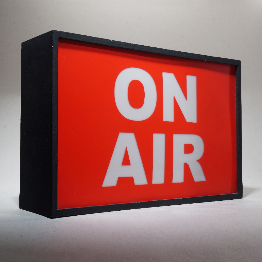 Das "ON AIR" Schild ist beleuchtet, wahlweise kann es auf blinken umgestellt werden, besonders leicht und batteriebetrieben.